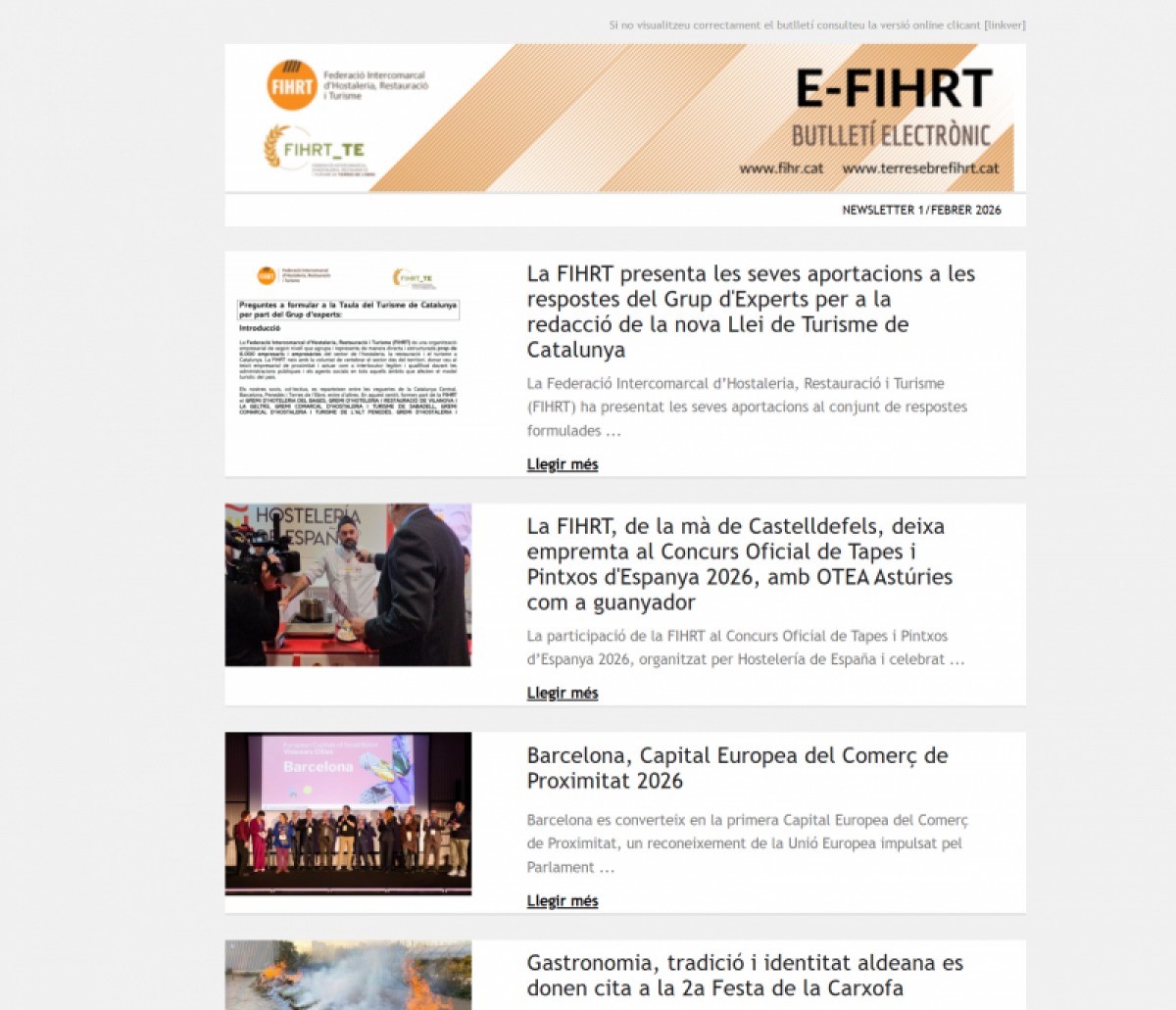 L'E-FIHRT 1/FEBRER 2026 recull les principals actuacions, esdeveniments i posicionaments que defineixen l’actualitat de l’hostaleria, la restauració i el turisme a Catalunya i a l’Estat.