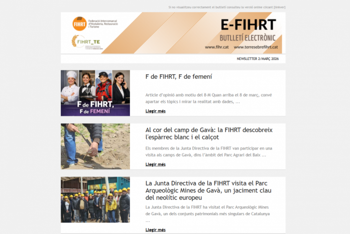 En aquest E-FIHRT 2 de març de 2026, la Federació posa el focus en una data especialment significativa com és el 8 de Març, amb l’article “F de FIHRT, F de femení”, que reivindica el paper de les dones al sector i convida a mirar la realitat amb dades, compromís i voluntat de transformació. Alhora, aquest butlletí reflecteix una FIHRT activa, connectada amb el territori i compromesa amb la promoció del patrimoni, el producte local, la gastronomia i el turisme, com demostren les visites als camps de Gavà i al Parc Arqueològic de les Mines de Gavà.