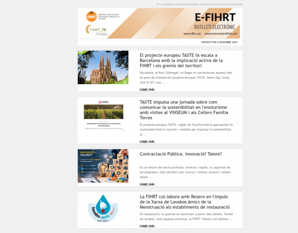 El butlletí E-FIHRT 4/MARÇ 2026: Els gremis i el territori activen una primavera de projectes, sostenibilitat i promoció presenta aquesta setmana un ecosistema sectorial molt orientat a la governança col·laborativa, la competitivitat territorial, la sostenibilitat turística, la promoció gastronòmica i comercial i la professionalització del sector.