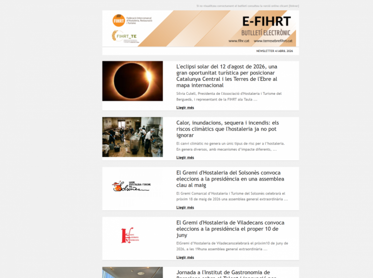 Aquesta setmana, el nou E-FIHRT 4/abril 2026 arriba carregat de continguts estratègics per al sector turístic, hoteler i de restauració, demostrant un cop més la capacitat de la FIHRT de connectar actualitat, territori i oportunitats per als seus gremis i associats.